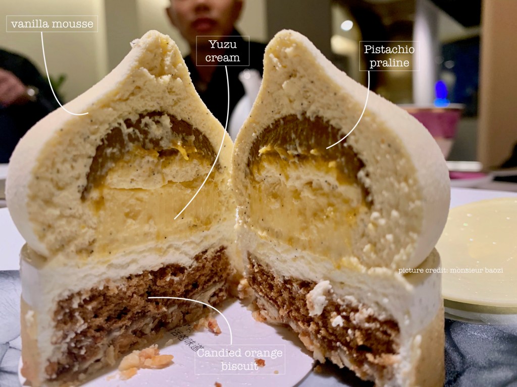 I cut it in half, and find inside a Yuzu cream, this Japanese citrus with subtle tangerine notes, and a dripping heart of praline with pistachio that brings so much pleasure!