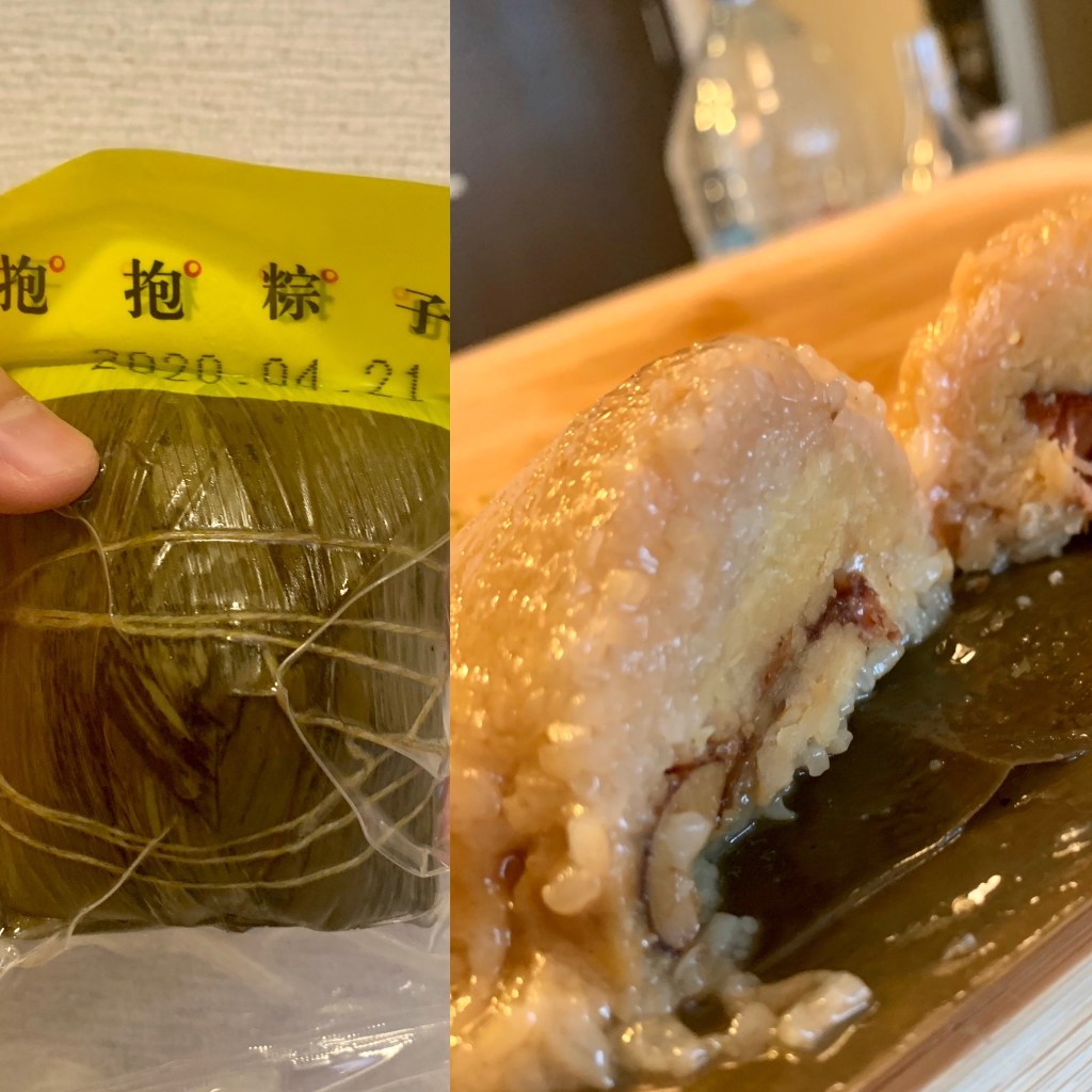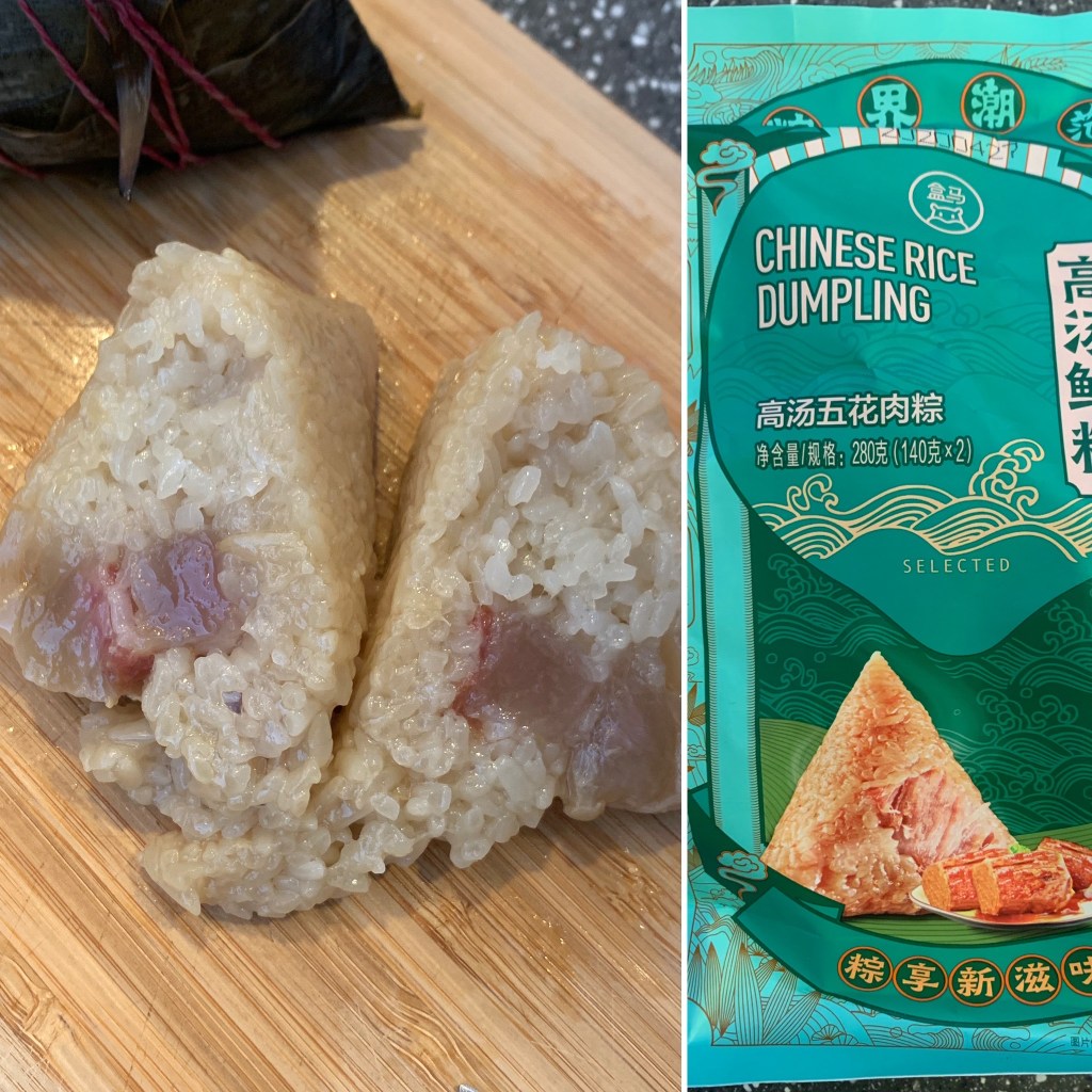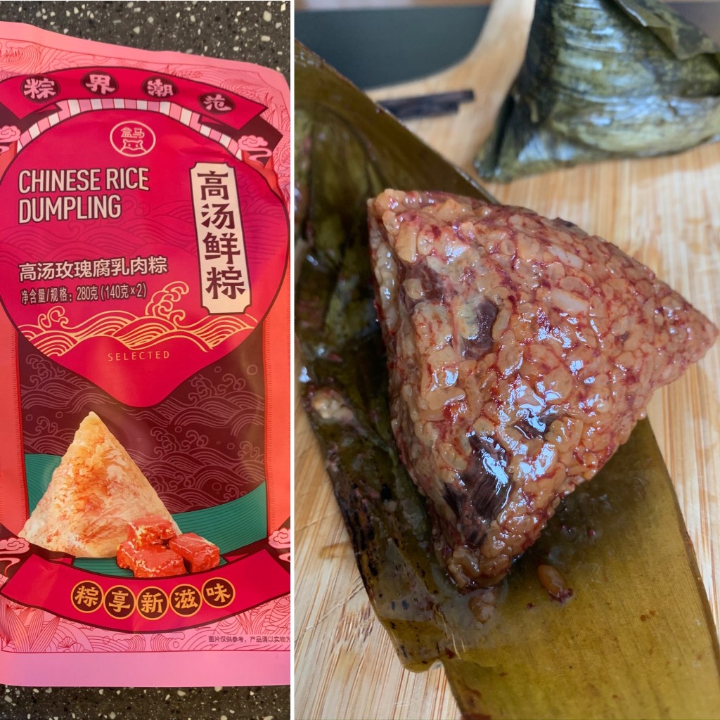 This version from Hema contains rice from 东北 DongBei (Noth-East China), pork belly, Furu (tofu fermented in alcohol) and chicken broth. It is a rich and tasty zongzi, quite powerful and very characteristic. The Furu gives off chocolatey notes. It’s a very rich and tasty one.