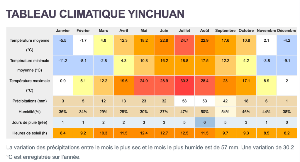 The climate of Yinchuan (capital of the province) is said to be “steppe”. There is little rainfall, whatever the time of year.